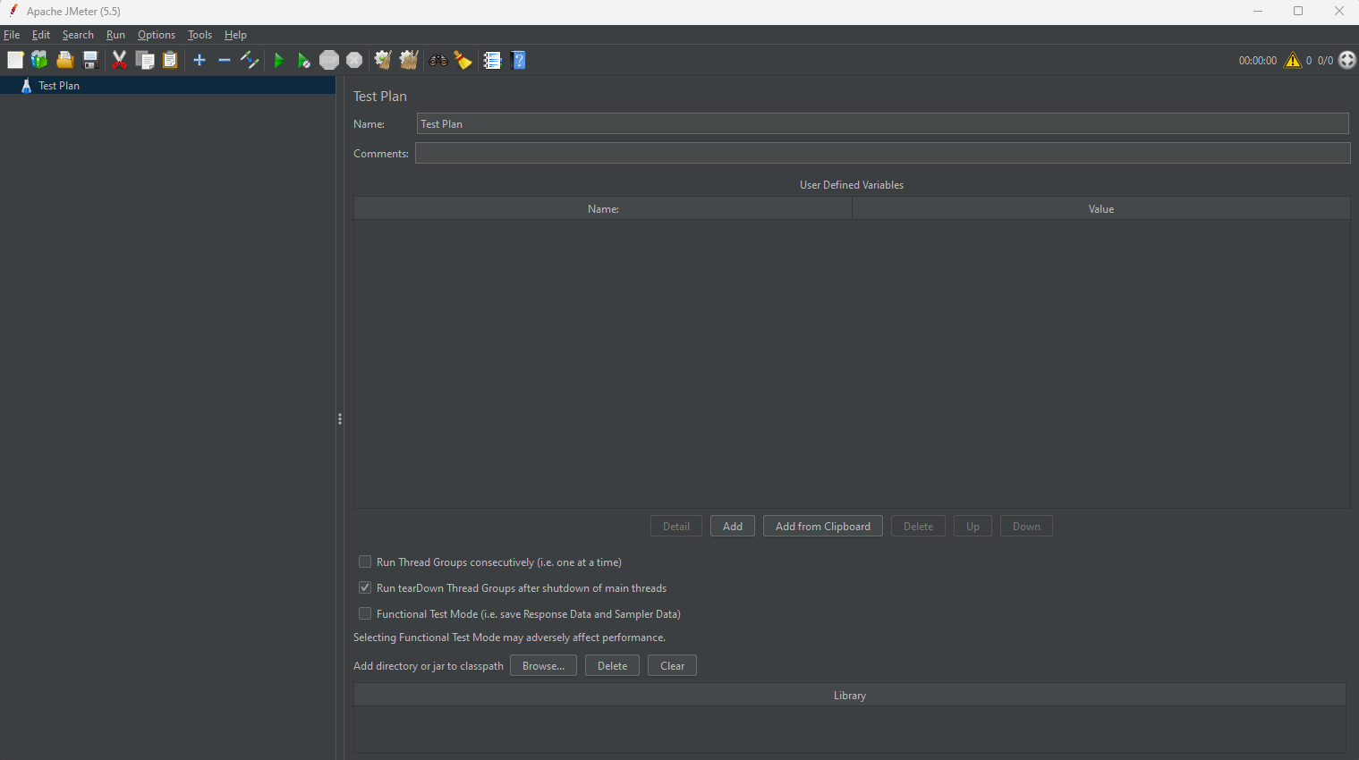 https://jmeter.apache.org/download_jmeter.cgi에서 Binary의 apache-jmeter-5.5.zip를 다운받고 압축을 푼다.